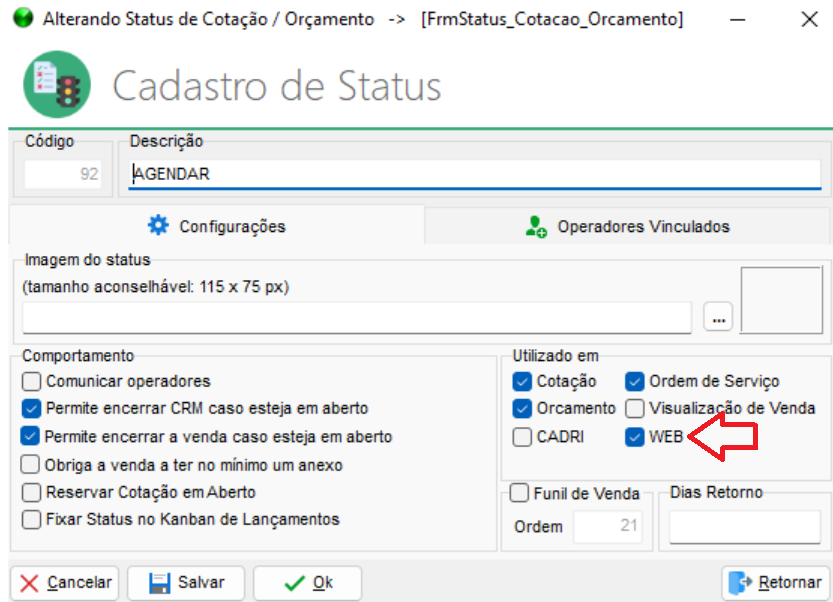 Pré-requisito: para qualquer status ser considerado no kanban (aparecer em lista, fixado ou não), a flag “WEB” no cadastro do status deve estar marcada. Sem essa flag, o status é ignorado pelo kanban, mesmo que alguma regra de fixação esteja ativa.