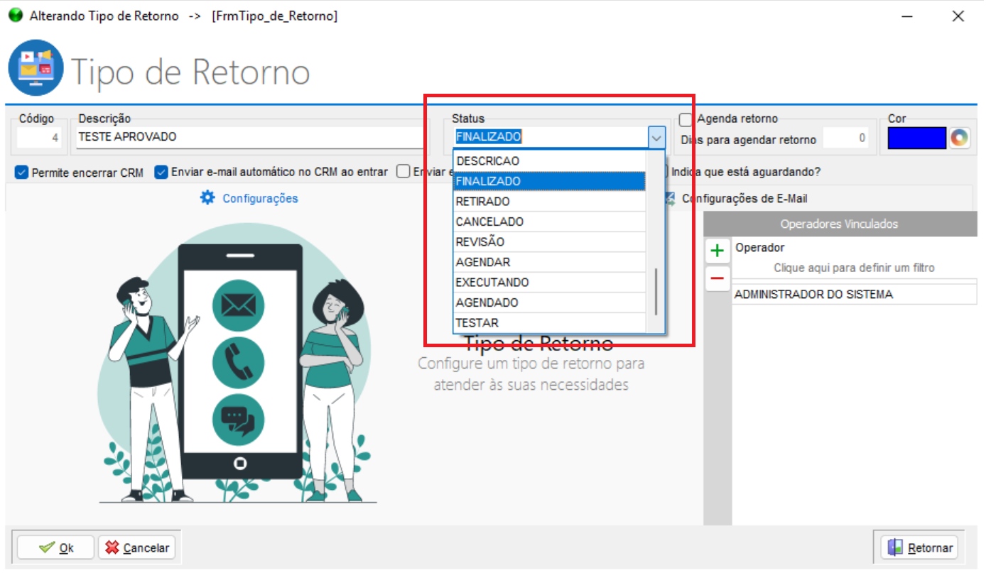 Atendimentos não usam “Status”, e sim Tipos de Retorno. Para que apareçam no kanban, é necessário: