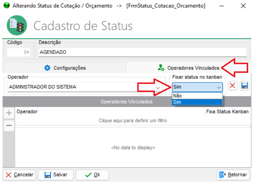 - Por operador (prioridade intermediária) – No vínculo do status com o operador, escolha “Sim“ em “Fixar status no kanban”. A lista será exibida sempre para aquele operador específico.